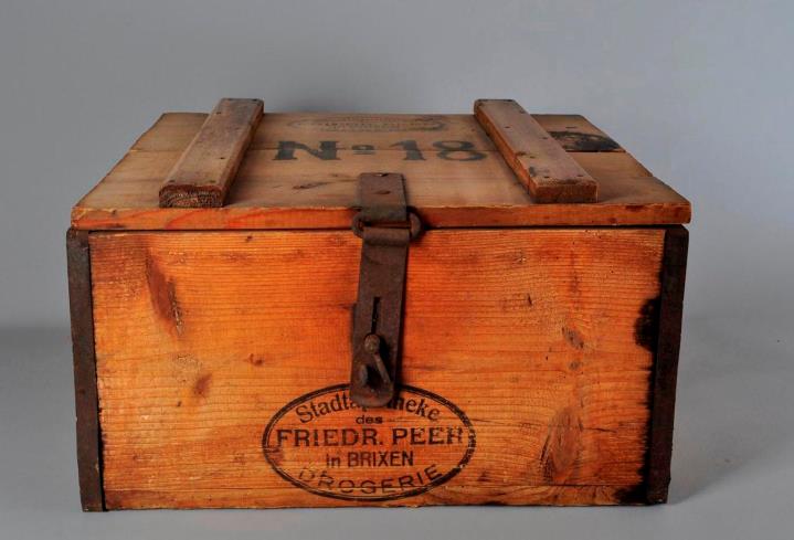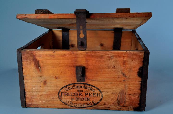 Transportkiste Nr. 18 aus Holz für 25 Limonadenflaschen mit Scharnierdeckel, mit einem Vorhängschloss versperrbar. Seitlich zwei Einsparungen zum Tragen der Kiste. Innen ohne Querteiler aus Holz für die Flaschen. Eingebranntes Logo in ovaler Kartusche der "Stadtapotheke des Friedrich Peer in Brixen Drogerie" an allen vier Seiten und am Deckel. Deckel außen mit zwei Holzleisten verstärkt. Boden genagelt, Seitenteile gezinkt und mit einem im Holz eingefräßten Eisenband verstärkt. Wenige Holzwurmlöchern.