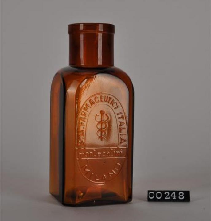 Im Grundriss quadratische Weithalslasche mit verstärkter Mundung und abgeflachten Kanten. Eingeprägtem Firmenzeichen in ovaler Kartusche: S.A.Farmaceutici Italia Montecatini Milano und Äskulapstab mit zwei Nattern. Braunes Glas.