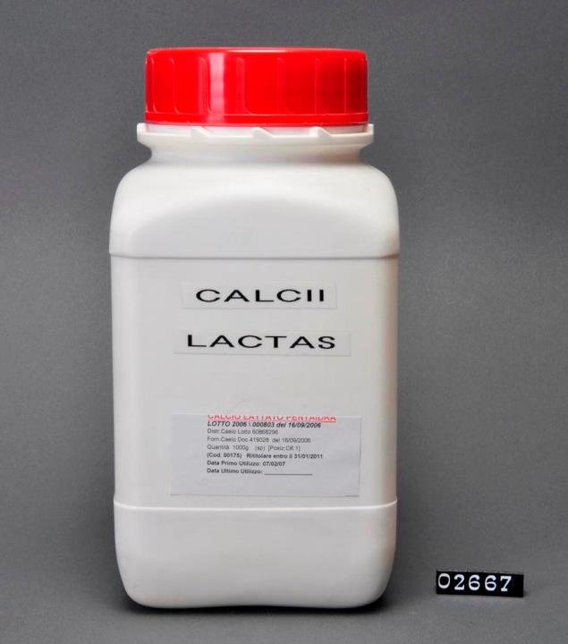 Weißer, im Grundriss quadratischer Niederdruckpolyethylenbehälter mit rotem Schraubverschluss aus Polypropylen. Laminiertem Schriftband schwarz auf weiß, signiert mit Calcii lactas. Darunter Chargenetikett. Enthält Calciumlactat.