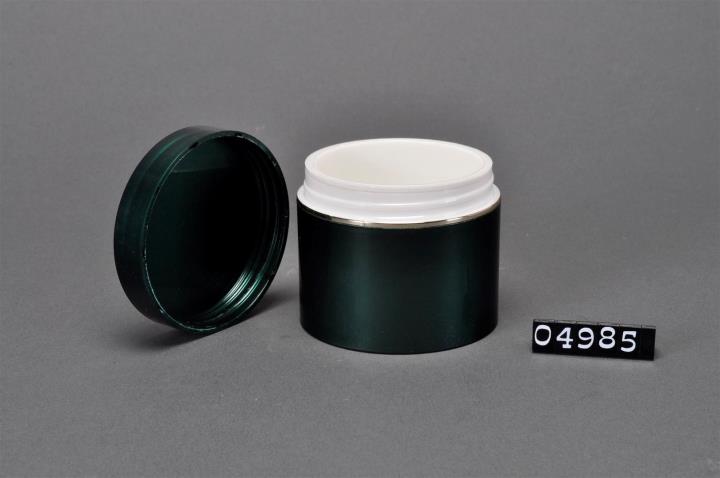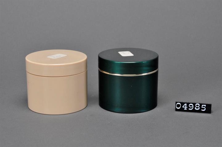 Zwei doppelwandige Mustersalbendosen, eine grün mit Goldrand und eine elfenbeinfarbig. Aufgeschraubter Deckel, elfenbeinfarbige mit Dichteinlage, grüne ohne. Boden mit Standring. Hergestellt von der Firma MAV aus Bologna.