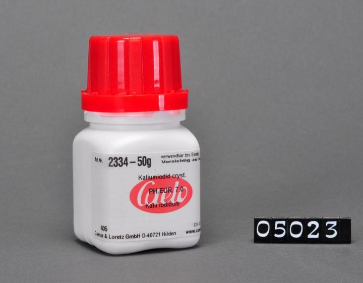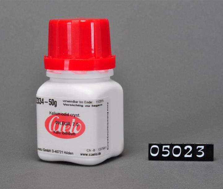 Weißer Kunststoffbehälter aus Polyethylen (PE), hergestellt durch Extrusionsblasen, mit rotem Schraubverschluss und Sicherheitsring aus PP. Original verschlossen. Etikett der Firma Caesar & Loretz, D-40721 Hilden (Caelo). Verwendbar bis Ende: 11/2015.