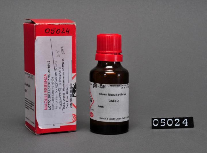 Kleine braune Glasflasche mit rotem Schraubverschluss und Sicherheitsring aus PP. Etikett der Firma Caesar & Loretz, D-40721 Hilden (Caelo). Verwendbar bis Ende: 06/2013. Mit rotem Umkarton und Analysenzertifikat sowie Chargenetikett der Stadtapotheke. Enthält naturidentisches Niaouliöl.