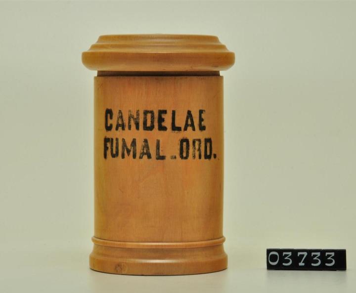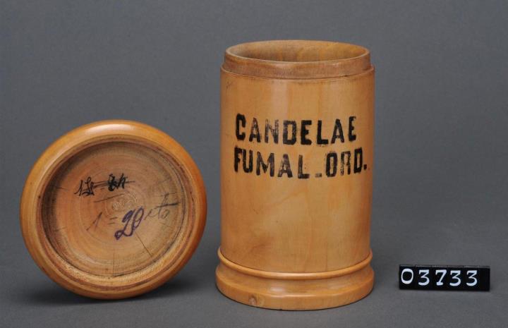 Hellbraune, zylinderförmige Holzdose (Holzbüchse) mit abgesetztem Standfuß bestehend aus Halbrundstab, Kehlung und geradem Abschluss. Flacher Stülpdeckel mit gerundetem Deckelrand und darüber zwei Kehlungen. Schwarz signiert. Innenseite Deckel mit Preisangaben: 1 Stück 6 Heller, dann acht Heller, später 20 Centesimi. Enthielt gewöhnliche Rauchkerzen.