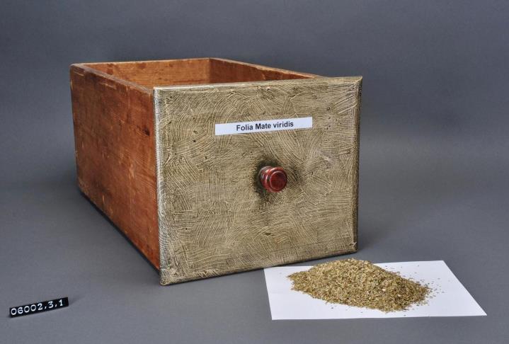 Schublade aus Nadelholz mit rotem Knauf und gezinkten Verbindungen (Schwalbenschwanzverbindung). Boden angeleimt und mit Holznägeln gesichert. Teilweise wurmstichig. Vorderfront grau-braun angemalen. Mit selbstklebendem, laminiertem, weißem Kunststoff-Schriftband beschriftet. Enhält grüne Mateblätter, geschnitten.