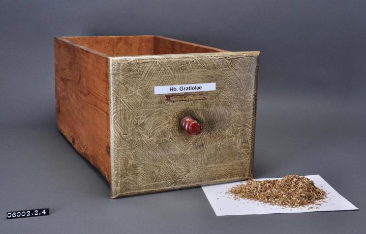 Schublade aus Nadelholz mit rotem Knauf und gezinkten Verbindungen (Schwalbenschwanzverbindung). Boden angeleimt und mit Holznägeln gesichert. Leicht wurmstichig. Vorderfront grau-braun angemalen. Mit selbstklebendem, laminiertem, weißem Kunststoff-Schriftband beschriftet. Enhält geschnittenes Gottesgnadenkraut.