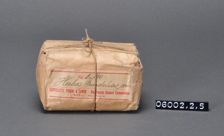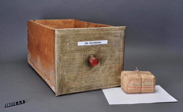 Schublade aus Nadelholz mit rotem Knauf und gezinkten Verbindungen (Schwalbenschwanzverbindung). Boden angeleimt und mit Holznägeln und Eisennägeln gesichert. Leicht wurmstichig. Vorderfront grau-braun angemalen. Mit selbstklebendem, laminiertem, weißem Kunststoff-Schriftband beschriftet. Enhält geschnittenes Grindelienkraut, in Original-Packung der Fa. Cappelletti Pisoni & Zanon, Trento