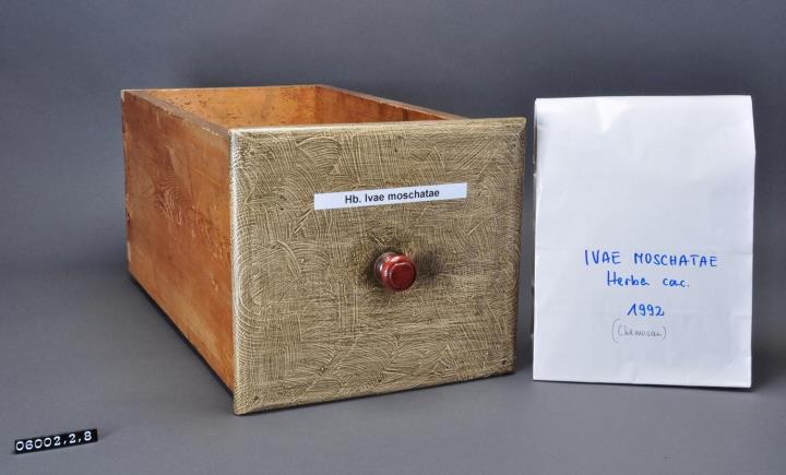 Schublade aus Nadelholz mit rotem Knauf und gezinkten Verbindungen (Schwalbenschwanzverbindung). Boden angeleimt und mit Holznägeln gesichert. Massivere Bauweise. Vorderfront grau-braun angemalen. Mit selbstklebendem, laminiertem, weißem Kunststoff-Schriftband beschriftet. Papiersdack beschriftet von Lioba Sperber. Enhält Moschus-Schafgarbe geschnitten.