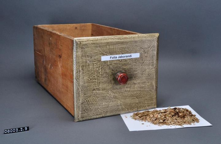 Schublade aus Nadelholz mit rotem Knauf und gezinkten Verbindungen (Schwalbenschwanzverbindung). Boden angeleimt und mit Holznägeln gesichert. Leicht wurmstichig. Vorderfront grau-braun angemalen. Mit selbstklebendem, laminiertem, weißem Kunststoff-Schriftband beschriftet. Lt. Schild an der Seitenwand war in dieser Schublade früher Leinsamen. Enhält heute geschnittene Jaborandiblätter.