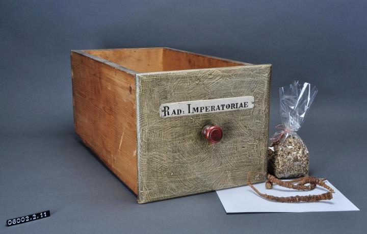 Schublade aus Nadelholz mit rotem Knauf und gezinkten Verbindungen (Schwalbenschwanzverbindung). Boden angeleimt und mit Holznägeln gesichert. Massivere Bauweise. Vorderfront grau-braun angemalen. Alte Beschriftung, weiß auf schwarzem Grund, auf Blechband aufgemalen und mit zwei Nägeln befestigt. Enhält ganze und geschnittene Meisterwurz.
