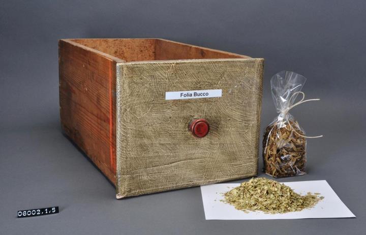 Schublade aus Nadelholz mit rotem Knauf und gezinkten Verbindungen (Schwalbenschwanzverbindung). Boden angeleimt und mit Holznägeln gesichert. Leicht wurmstichig. Vorderfront grau-braun angemalen. Mit selbstklebendem, laminiertem, weißem Kunststoff-Schriftband beschriftet. Enhält geschnittene und ganze Buccoblätter.