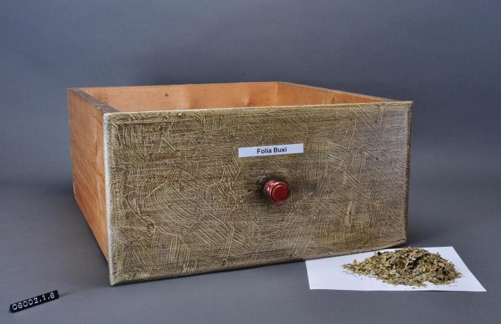 Schublade aus Nadelholz mit rotem Knauf und gezinkten Verbindungen (Schwalbenschwanzverbindung). Boden angeleimt und mit Holznägeln gesichert. Vorderfront grau-braun angemalen. Mit selbstklebendem, laminiertem, weißem Kunststoff-Schriftband beschriftet. Enhält Buchsbaumblätter, geschnitten.