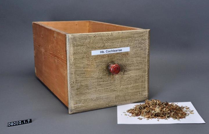 Schublade aus Nadelholz mit rotem Knauf und gezinkten Verbindungen (Schwalbenschwanzverbindung). Massivere Seitenwände. Boden angeleimt und mit Holznägeln gesichert. Vorderfront grau-braun angemalen. Mit selbstklebendem, laminiertem, weißem Kunststoff-Schriftband beschriftet. Enhält geschnittenes Löffel-Kraut auch Scharbockheil genannt.