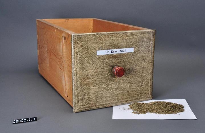 Schublade aus Nadelholz mit rotem Knauf und gezinkten Verbindungen (Schwalbenschwanzverbindung). Boden angeleimt und mit Holznägeln gesichert. Leicht wurmstichig. Vorderfront grau-braun angemalen. Mit selbstklebendem, laminiertem, weißem Kunststoff-Schriftband beschriftet. Enhält gerebeltes Estragonkraut.