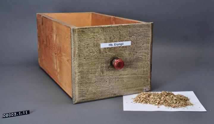 Schublade aus Nadelholz mit rotem Knauf und gezinkten Verbindungen (Schwalbenschwanzverbindung). Boden angeleimt und mit Holznägeln gesichert. Leicht wurmstichig. Vorderfront grau-braun angemalen. Mit selbstklebendem, laminiertem, weißem Kunststoff-Schriftband beschriftet. Enhält Mannstreu-Kraut, geschnitten, auch Brachdiestel genannt.