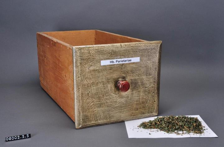 Schublade aus Nadelholz mit rotem Knauf und gezinkten Verbindungen (Schwalbenschwanzverbindung). Boden angeleimt und mit Holznägeln gesichert. Vorderfront grau-braun angemalen. Mit selbstklebendem, laminiertem, weißem Kunststoff-Schriftband beschriftet. Enhält Glaskraut, geschnitten.