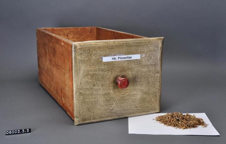 Schublade aus Nadelholz mit rotem Knauf und gezinkten Verbindungen (Schwalbenschwanzverbindung). Boden angeleimt und mit Holznägeln gesichert. Vorderfront grau-braun angemalen. Mit laminiertem Schriftband beschriftet. Enhält Mausohrkraut, geschnitten.