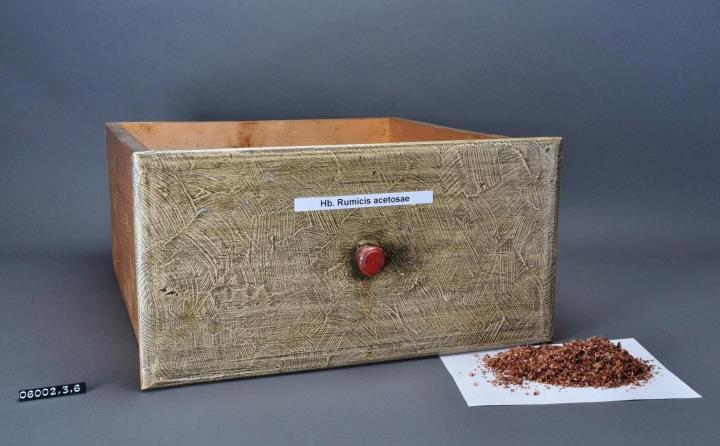 Schublade aus Nadelholz mit rotem Knauf und gezinkten Verbindungen (Schwalbenschwanzverbindung). Boden angeleimt und mit Holznägeln gesichert. Vorderfront grau-braun angemalen. Mit selbstklebendem, laminiertem, weißem Kunststoff-Schriftband beschriftet. Enhält Sauerampfer-Kraut, geschnitten.