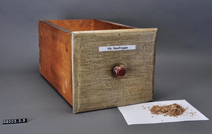 Schublade aus Nadelholz mit rotem Knauf und gezinkten Verbindungen (Schwalbenschwanzverbindung). Massivere Seitenteile. Boden angeleimt und mit Holznägeln gesichert. Vorderfront grau-braun angemalen. Mit selbstklebendem, laminiertem, weißem Kunststoff-Schriftband beschriftet. Enhält Steinbrechkraut, geschnitten.