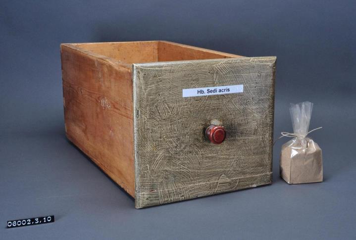 Schublade aus Nadelholz mit rotem Knauf und gezinkten Verbindungen (Schwalbenschwanzverbindung). Boden angeleimt und mit Holznägeln gesichert. Seitenteile massiver als bei anderen Schubladen. Vorderfront grau-braun angemalen. Mit Kunsstoff-Schriftband beschriftet. Enhält Mauerpfefferkraut, gepulvert.