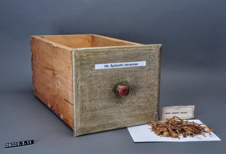 Schublade aus Nadelholz mit rotem Knauf und gezinkten Verbindungen (Schwalbenschwanzverbindung). Boden angeleimt und mit Holznägeln gesichert. Vorderfront grau-braun angemalen. Mit selbstklebendem, laminiertem, weißem Kunststoff-Schriftband beschriftet. Enhält Parakresse, ganz.
