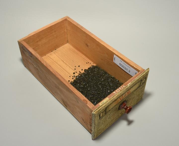 Aloe, eingedickter Saft. Schublade aus Nadelholz mit rotem Knauf und gezinkten Verbindungen (Schwalbenschwanzverbindung). Boden angeleimt und mit Holznägeln gesichert. Vorderfront grau-braun maseriert, mit roter Signatur in der aufgemalten Banderole. Enhält den eingedickten und zerstoßenen Saft der Aloe.