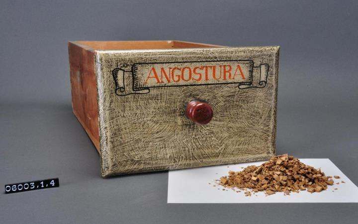 Schublade aus Nadelholz mit rotem Knauf und gezinkten Verbindungen (Schwalbenschwanzverbindung). Boden angeleimt und mit Holznägeln gesichert. Vorderfront maserierend grau-braun mit roter Signatur in aufgemalener Banderole. An der Schubladenseite gezahntes Etikett mit alter Preisangabe. Enhält echte Angosturarinde, geschnitten.