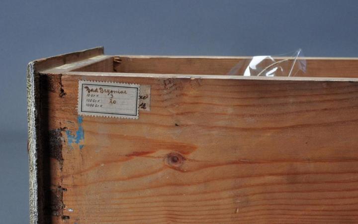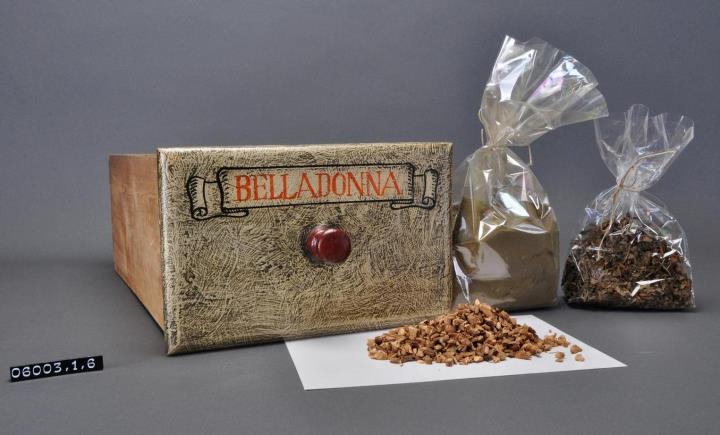 Schublade aus Nadelholz mit rotem Knauf und gezinkten Verbindungen (Schwalbenschwanzverbindung). Boden angeleimt und mit Holznägeln gesichert. Vorderfront maserierend grau-braun mit roter Signatur in aufgemalener Banderole. An der Schubladenseite gezahntes Etikett mit alter Preisangabe. Enhält Pulver, sowie geschnittene Blätter und Wurzel der Tollkirsche.