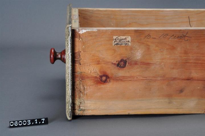 Schublade aus Nadelholz mit rotem Knauf und gezinkten Verbindungen (Schwalbenschwanzverbindung). Boden angeleimt und mit Holznägeln gesichert. Vorderfront maserierend grau-braun mit roter Signatur in aufgemalener Banderole. Enhält Ganzdroge und Pulver der Spanischen Fliegen.