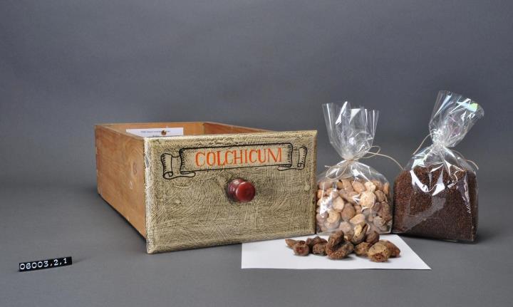 Schublade aus Nadelholz mit rotem Knauf und gezinkten Verbindungen (Schwalbenschwanzverbindung). Boden angeleimt und mit Holznägeln gesichert. Vorderfront maserierend grau-braun mit roter Signatur in aufgemalener Banderole. Enhält ganze, etwas wurmlöchrige Herbstzeitlosenknollen, sowie Herbstzeitlosensamen.