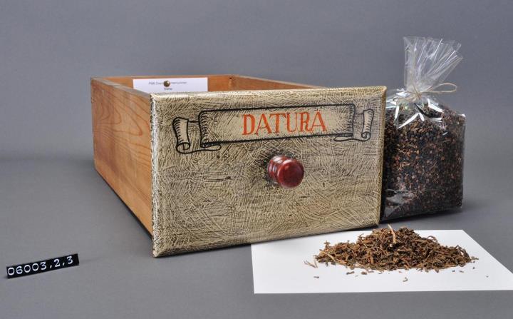 Schublade aus Nadelholz mit rotem Knauf und gezinkten Verbindungen (Schwalbenschwanzverbindung). Boden angeleimt und mit Holznägeln gesichert. Vorderfront maserierend grau-braun mit roter Signatur in aufgemalener Banderole. Enhält Stechpalmenblätter, geschnitten und ganze Stechapfelsamen.