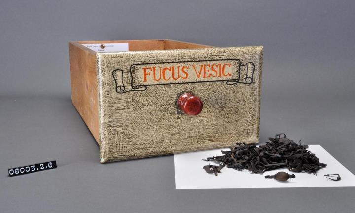 Schublade aus Nadelholz mit rotem Knauf und gezinkten Verbindungen (Schwalbenschwanzverbindung). Boden angeleimt und mit Holznägeln gesichert. Vorderfront maserierend grau-braun mit roter Signatur in aufgemalener Banderole. Enhält Blasentang, geschnitten.