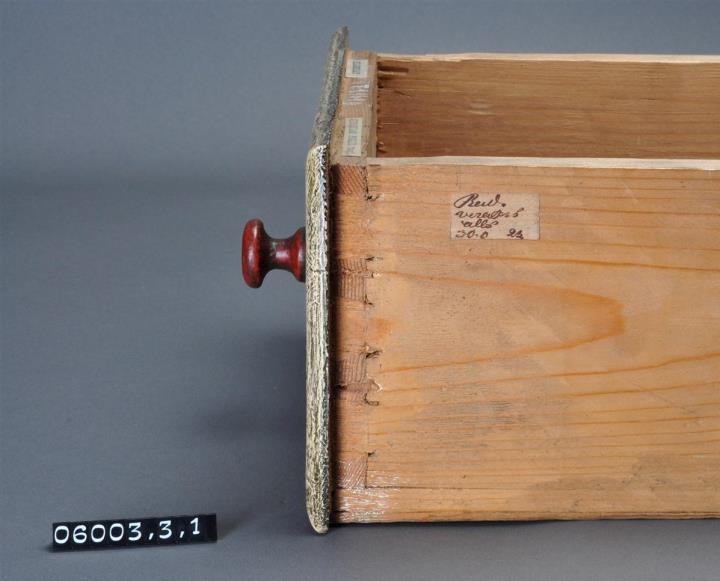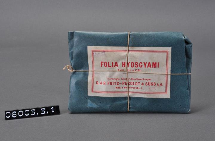 Schublade aus Nadelholz mit rotem Knauf und gezinkten Verbindungen (Schwalbenschwanzverbindung). Boden angeleimt und mit Holznägeln gesichert. Vorderfront maserierend grau-braun mit roter Signatur in aufgemalener Banderole. Enhält Bilsenkraut, grob geschnitten und ein Originalpaket der Firma Fritz-Pezoldt & Süss, Wien.
