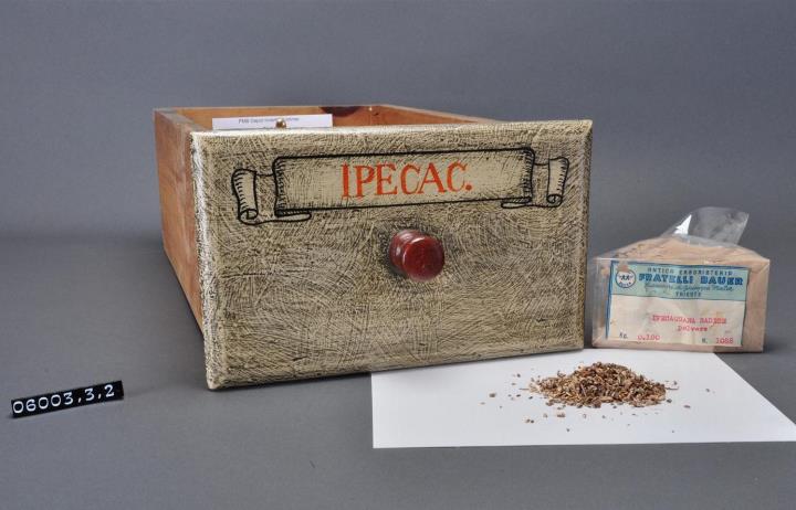 Schublade aus Nadelholz mit rotem Knauf und gezinkten Verbindungen (Schwalbenschwanzverbindung). Boden angeleimt und mit Holznägeln gesichert. Vorderfront maserierend grau-braun mit roter Signatur in aufgemalener Banderole. Enhält geschnitte Wurzel der Brechwurz sowie Brechwurzpulver.