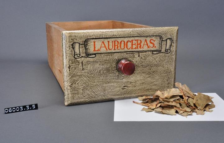 Schublade aus Nadelholz mit rotem Knauf und gezinkten Verbindungen (Schwalbenschwanzverbindung). Boden angeleimt und mit Holznägeln gesichert. Vorderfront maserierend grau-braun mit roter Signatur in aufgemalener Banderole. Enhält Kirschlorbeerbläter geschnitten.