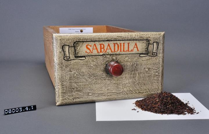 Schublade aus Nadelholz mit rotem Knauf und gezinkten Verbindungen (Schwalbenschwanzverbindung). Boden angeleimt und mit Holznägeln gesichert. Vorderfront maserierend grau-braun mit roter Signatur in aufgemalener Banderole. Enhält Läusesamen.