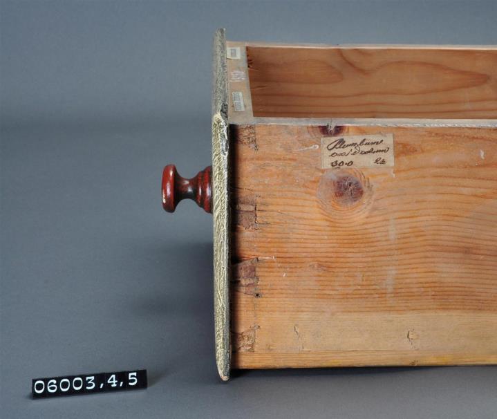 Schublade aus Nadelholz mit rotem Knauf und gezinkten Verbindungen (Schwalbenschwanzverbindung). Boden angeleimt und mit Holznägeln gesichert. An seitlicher Schubladenseite altes Preisschild. Vorderfront maserierend grau-braun mit roter Signatur in aufgemalener Banderole. Enhält Mutterkorn ganz und gepulvert. Mit Einkaufspreis (100g Lire 1500.-) und -datum (Mai 1974), beschriftet von Toni Kerer.