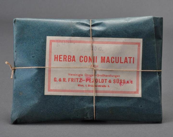 Schublade aus Nadelholz mit rotem Knauf und gezinkten Verbindungen (Schwalbenschwanzverbindung). Boden angeleimt und mit Holznägeln gesichert. Vorderfront maserierend grau-braun mit roter Signatur "Varia" in aufgemalener Banderole. Enhält eine historische Packung beschriftet "Semina Conii maculati seu Cicutae vulgaris" (ab anno 1847); eine Originalpackung, beschriftet "Herba Conii maculati 10g von Fritz-Petzold & Süss AG, Wien; zwei Packungen mit Etikett der Stadtapotheke des Friedr. Peer in Brixen mit historischer Beschriftung "20g Herb.Conii macul. 1913".
