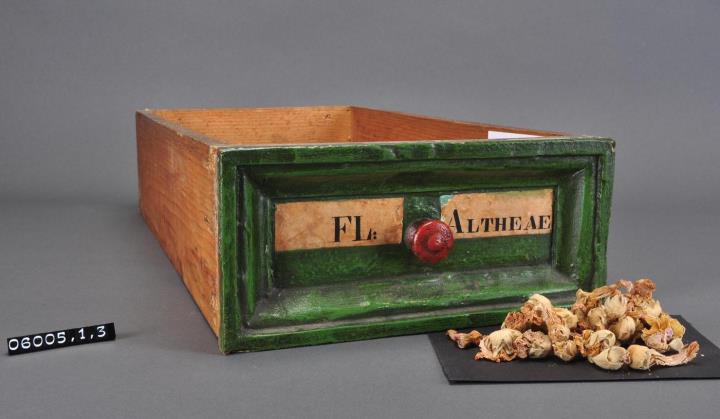 Schublade aus Nadelholz mit rotem Knauf und gezinkten Verbindungen (Schwalbenschwanzverbindung). Boden angeleimt und mit Holznägeln gesichert. Vorderfront grün mit aufgeklebter Papiersignatur. Enthält Eibischblütrn ganz.