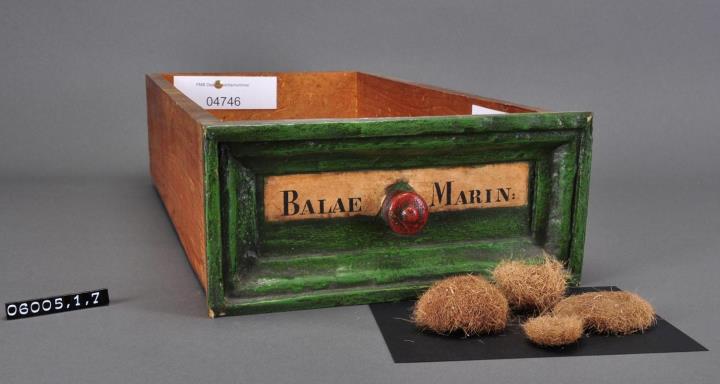 Schublade aus Nadelholz mit rotem Knauf und gezinkten Verbindungen (Schwalbenschwanzverbindung). Boden angeleimt und mit Holznägeln gesichert. Vorderfront grün mit aufgeklebter Papiersignatur. Enthält Meerballen.