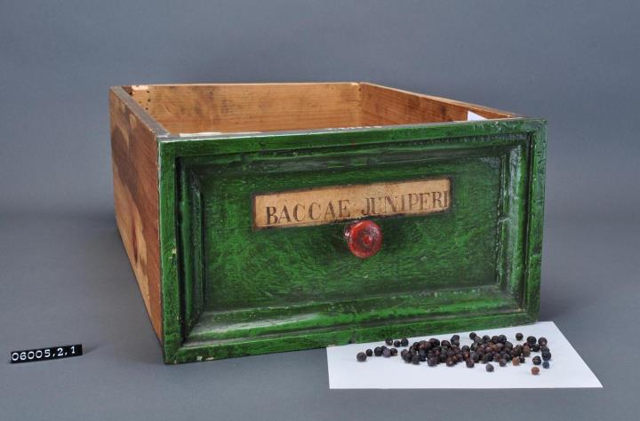 Schublade aus Nadelholz mit rotem Knauf und gezinkten Verbindungen (Schwalbenschwanzverbindung). Boden angeleimt und mit Holznägeln gesichert. Vorderfront grün mit aufgeklebter Papiersignatur. Enthält Wacholderbeeren, ganz.