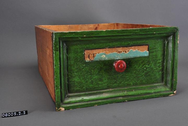 Schublade aus Nadelholz mit rotem Knauf und gezinkten Verbindungen (Schwalbenschwanzverbindung). Boden angeleimt und mit Holznägeln gesichert. Vorderfront grün mit aufgeklebter Papiersignatur. Beschriftung nicht mehr lesbar!