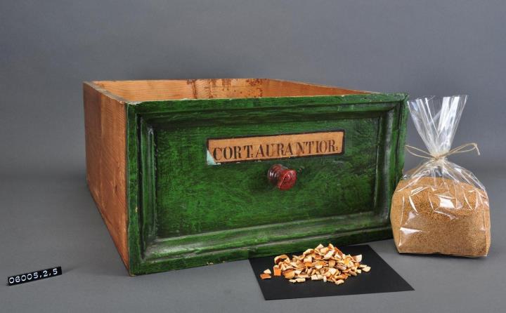 Schublade aus Nadelholz mit rotem Knauf und gezinkten Verbindungen (Schwalbenschwanzverbindung). Boden angeleimt und mit Holznägeln gesichert. Vorderfront grün mit aufgeklebter Papiersignatur. Enthält Orangenschalen geschnitten und Pulver.