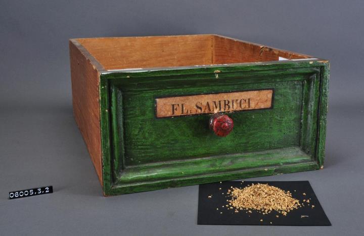 Schublade aus Nadelholz mit rotem Knauf und gezinkten Verbindungen (Schwalbenschwanzverbindung). Boden angeleimt und mit Holznägeln gesichert. Vorderfront grün mit aufgeklebter Papiersignatur. Enthält Holunderblüten gerebelt.