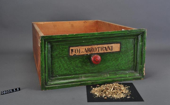 Schublade aus Nadelholz mit rotem Knauf und gezinkten Verbindungen (Schwalbenschwanzverbindung). Boden angeleimt und mit Holznägeln gesichert. Vorderfront grün mit aufgeklebter Papiersignatur. Enthält Eberrauten-Blätter.