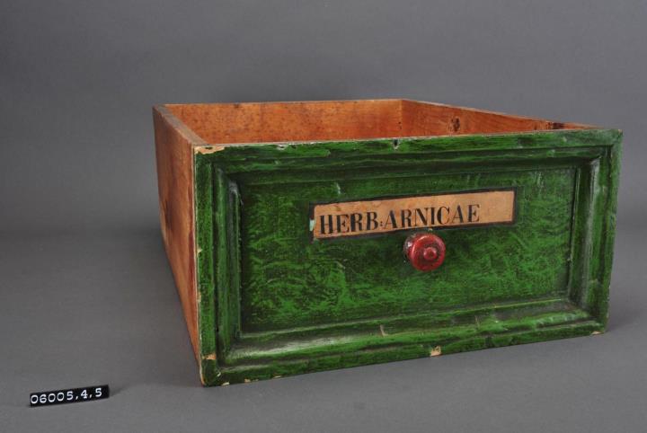 Schublade aus Nadelholz mit rotem Knauf und gezinkten Verbindungen (Schwalbenschwanzverbindung). Boden angeleimt und mit Holznägeln gesichert. Vorderfront grün mit aufgeklebter Papiersignatur. Ohne Inhalt