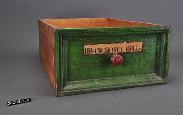 Schublade aus Nadelholz mit rotem Knauf und gezinkten Verbindungen (Schwalbenschwanzverbindung). Boden angeleimt und mit Holznägeln gesichert. Vorderfront grün mit aufgeklebter Papiersignatur. Ohne Inhalt.