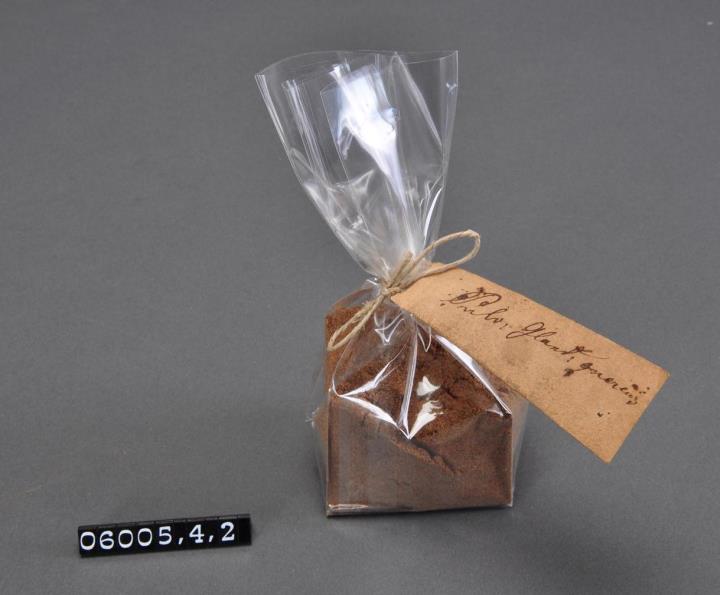 Schublade aus Nadelholz mit rotem Knauf und gezinkten Verbindungen (Schwalbenschwanzverbindung). Boden angeleimt und mit Holznägeln gesichert. Vorderfront grün mit aufgeklebter Papiersignatur. Enthält Pulver von gerösteten Eicheln.