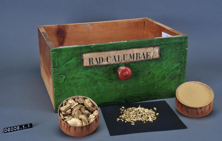 Schublade aus Nadelholz mit rotem Knauf und gezinkten Verbindungen (Schwalbenschwanzverbindung). Boden angeleimt und mit Holznägeln gesichert. Vorderfront grün mit aufgeklebter Papiersignatur. Enthält Kolombo-Wurzel, Ganzdroge, geschnitten und Pulver.