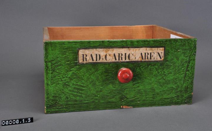 Schublade aus Nadelholz mit rotem Knauf und gezinkten Verbindungen (Schwalbenschwanzverbindung). Boden angeleimt und mit Holznägeln gesichert. Vorderfront grün mit aufgeklebter Papiersignatur. Enthielt Sandseggen-Wurzel, Rote Queckenwurzel.