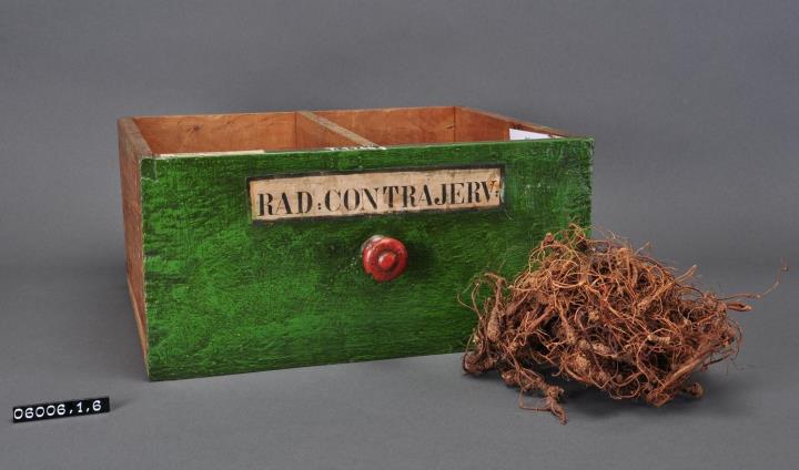 Schublade aus Nadelholz mit rotem Knauf und gezinkten Verbindungen (Schwalbenschwanzverbindung). Boden angeleimt und mit Holznägeln gesichert. Mittiger Abteiler. Vorderfront grün mit aufgeklebter Papiersignatur. Enthält Contrajerven-Wurzel, Bezoarwurzel.